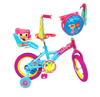 Give your Lalaloopsy fan a special treat with the Lalaloopsy 12" Bike with Doll Carrier and Bag. Featuring colorful graphics from MGA Entertainment's Lalaloopsy dolls, your little girl will be delighted when she's presented with this unique bicycle with bag. She'll love the opportunity to go riding with her favorite rag doll in this Lalaloopsy Bicycle with doll carrier. Featuring a special place for her favorite Lalaloopsian, a doll seat is installed just behind the bike seat for twin rides all day long. Also enchanced with a zip-up graphic handlebar bag, your little girl can carry all her favorite toys on her Lalaloopsy Bicycle. Plus, the colorful handlebar fringe will make your little one feel like a princess while she rides. With sturdy steel construction and requiring some adult assembly, this bike is safe for toddlers and will give parents peace of mind. If you have a Lalaoopsy fan in your life, treat her with this Toddler Girls Bicycle.