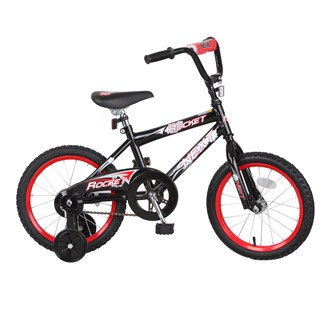 Ride the sidewalk in style on the Rocket Boys' Bike. The single speed bike has a steel frame with rigid suspension. It has padded handlebars and a doubleguard chain guard for extra protection, and includes training wheels for added stability.