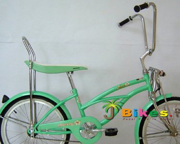 Micargi Hero 20" girls mint green lowrider beach cruiser bike features a cruiser banana seat with 36 stainless steel spokes on white wall cruiser tires. This lowrider cruiser bike is equipped with the smaller version ape-hanger cruiser handlebar to compromise the front springer fork. The Micargi Hero 20" girls lowrider beach cruiser bike also equipped with colored fenders and a coaster brake.