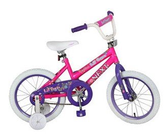 The NEXT 16" Lil' Gem Girls' Bike offers a great way for your child to learn to ride. It features a sturdy frame, padded handle bar and comes with training wheels to help your child learn to ride. It has a double-guard chain guard and coaster brakes for safety. Assembly is easy, so you can get them out riding in no time.