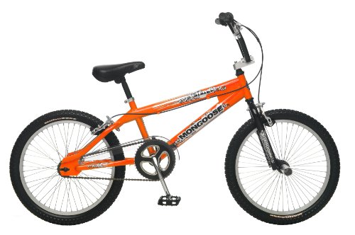 The Mongoose Strike boy's BMX bicycle is an ideal ride for kids who want to zip around the neighborhood in style. The bike is equipped with a handcrafted high-tensile steel frame and fork, giving riders good control whether riding on trails or the street. The bike also includes sure-stopping front and rear caliper brakes and extra-wide two-inch tires that roll smoothly over both pavement and grass. And thanks to the adjustable quick-release seat, the bike fits boys of several different heights. Other details include two-piece freestyle bars with an alloy four-bolt stem, 48-spoke alloy rims, a one-piece crank with a 44t steel cutout chain wheel, and two front axle pegs. The bike is designed for kids between the ages of 6 and 12.