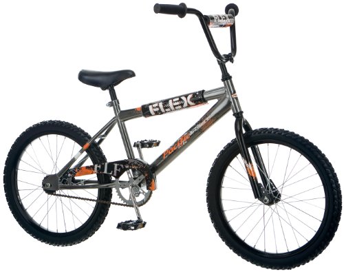The Pacific Cycle Flex bike is ready to hit the pavement with its rugged steel frame, colorful paint and graphics, comfortable seat and smooth riding tires. Features: 20" frame geometry for easy controlled riding Rear coaster brake stops securely 1-Piece crank with steel chain guard for durability, steel black wheels with 20X1.95 tires roll fast, handlebar and frame top tube pad for safety & style. Some assembly required.